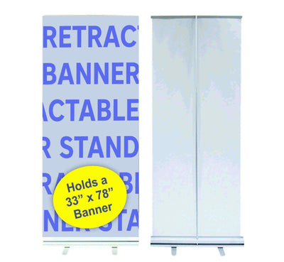 This is a very handy retractable banner stand. Make your banner 32" x 78" and attach to preset double sided tape edge. Solid aluminum construction for years of service. Stands upright on legs that rotate out from base. Includes convenient carrying case.