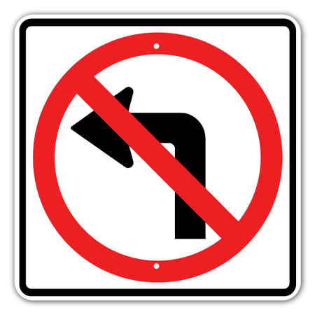 No Left Turn Sign that meets Federal and State fabrication requirements (R3-2). 24" x 24" Printed on High Intensity Prismatic sheeting and mounted to .080 heavy gauge aluminum. Typical outdoor life is 10+ years